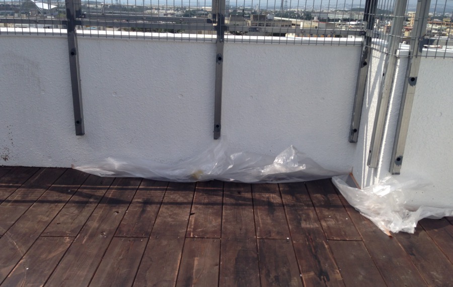 ちなみに養生しようとして吹き飛んだビニールがこちら。もう何をやってもダメ。全部吹っ飛びます。