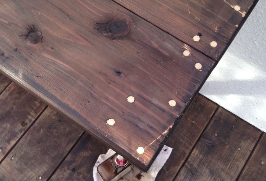 ステインを一度塗り、ネジを隠すようにダボ木を入れていきます。